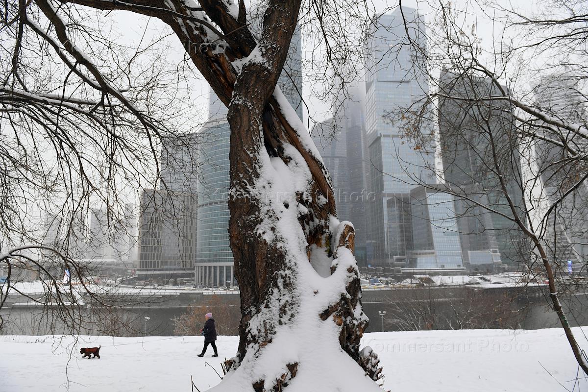 Снегопад в городе. Жанровая фотография. Дерево, заметенное снегом, на фоне башен Московского международного делового центра "Москва-Сити".