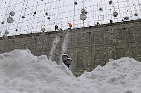 Жанровая фотография. Храм Василия Блаженного и Спаская башня Кремля за кучей снега.