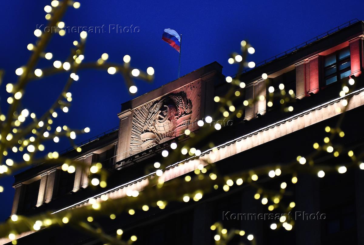 Виды Москвы. Жанровая фотография. Вечерняя иллюминация на верках дерева на фоне здания Государственной думы России.