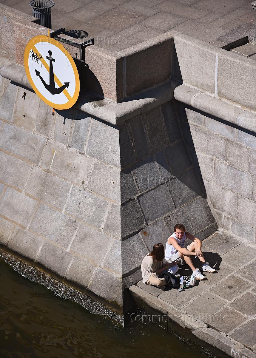Жанровая фотография. Жаркая погода в городе. Люди отдыхают на берегу пруда в центре города.