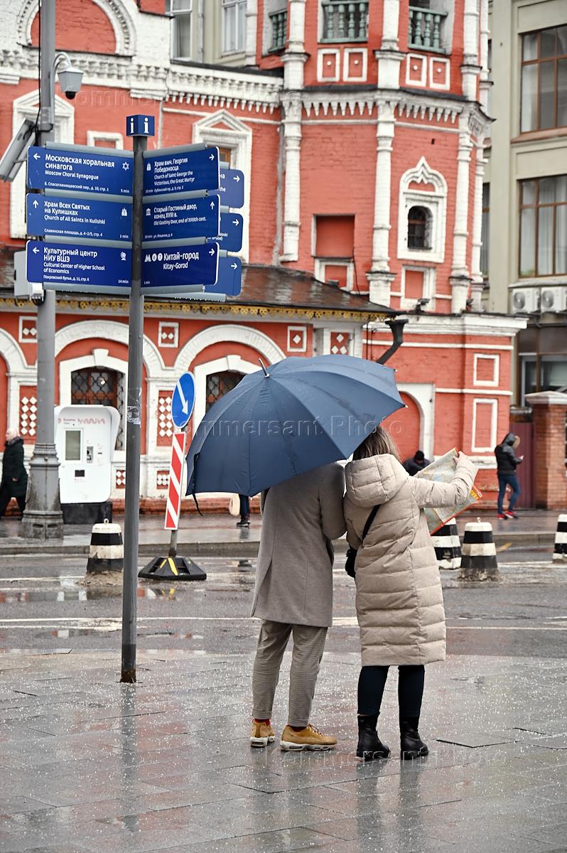 Жанровая фотография. Туристы в центре города под дождем.