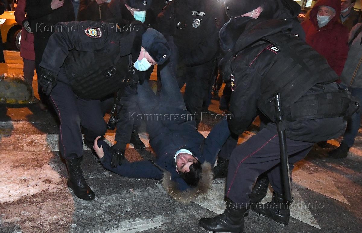 Сотрудники полиции задерживают активистку движения "Весна" Екатерину Бушкову, во время встречи политика Алексея Навального в аэропорту Внуково.