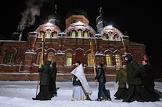Праздник Крещения Господня. Священнослужители во время обряда освящения воды в проруби на территории Свято-Введенского островного монастыря.