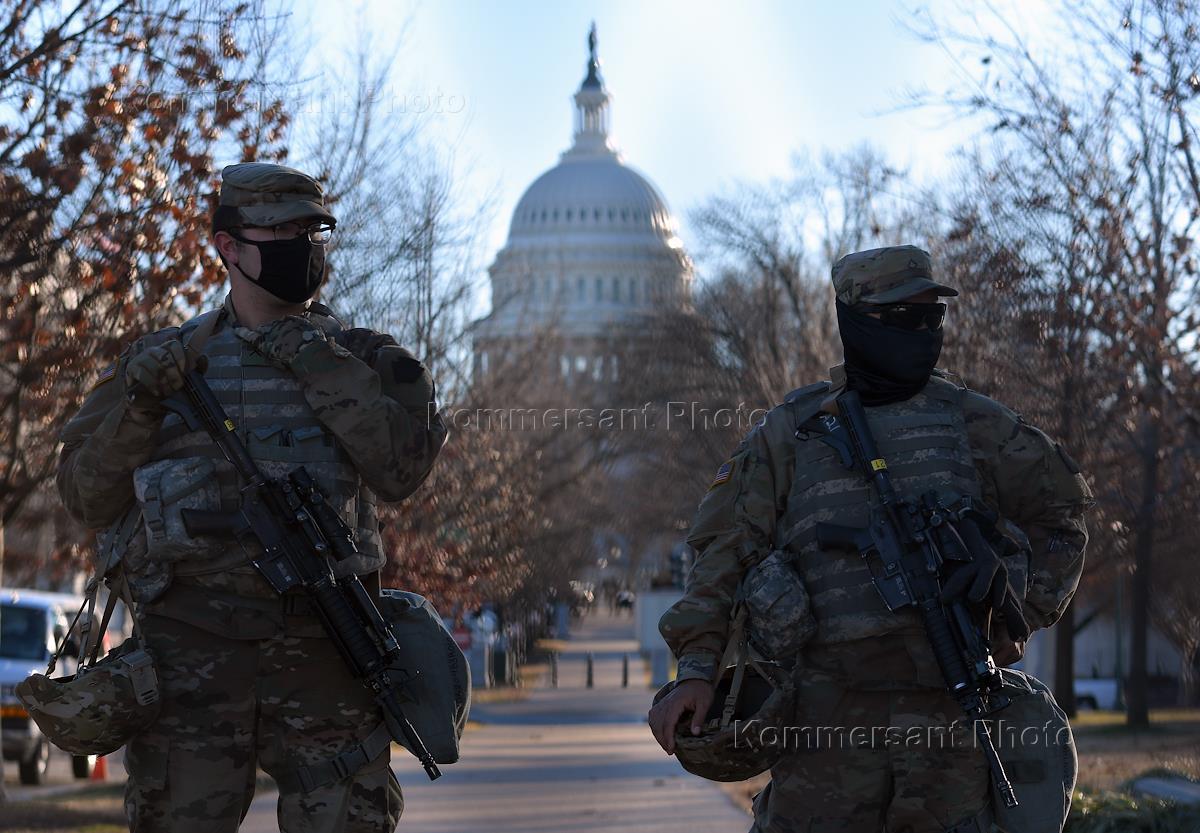 Подготовка к инаугурации избранного президента США Джозефа Байдена. Военнослужащие на территории Капитолия - здания Конгресса США.