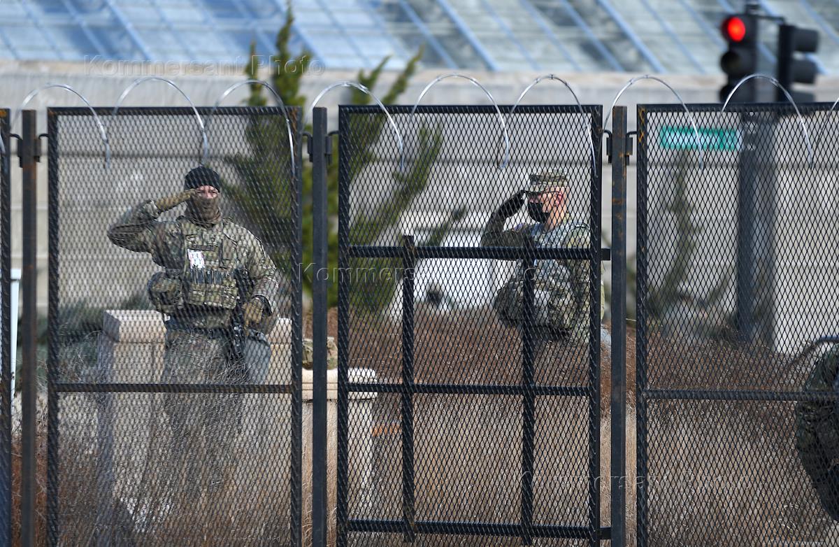 Подготовка к инаугурации избранного президента США Джозефа Байдена. Военнослужащие на огражденной территории Капитолия - здания Конгресса США.