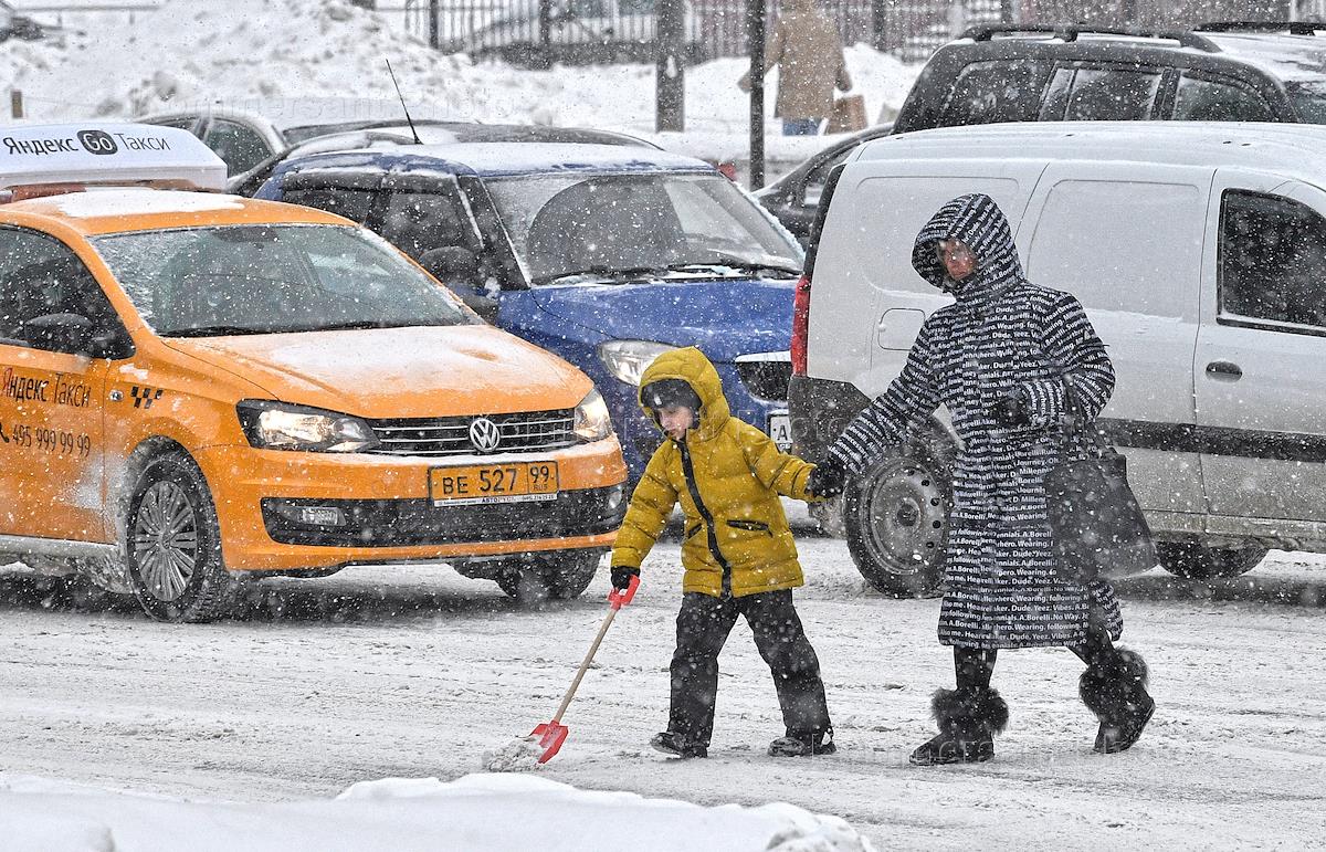 Views of Moscow during a snowfall. Genre photography. A woman and a child cross the street at a pedestrian crossing.