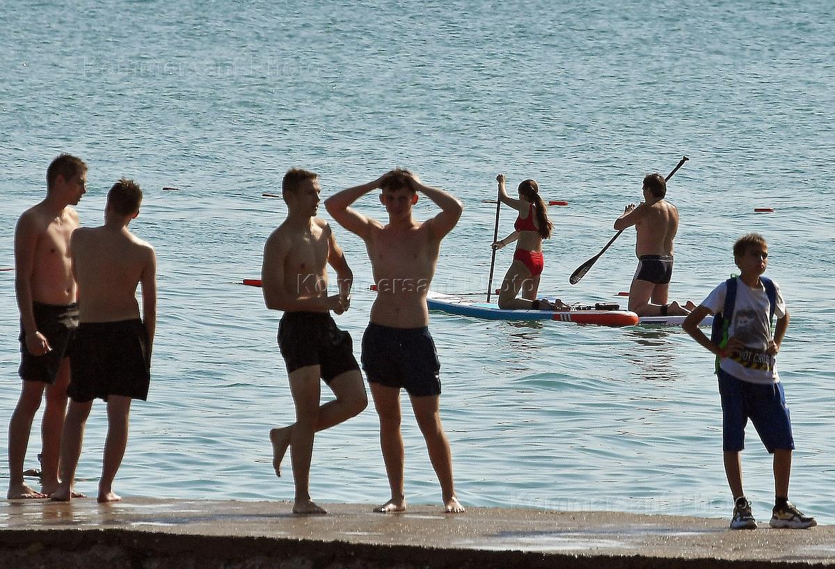 Жанровая фотография. Отдыхающие купаются в море на пляже.
