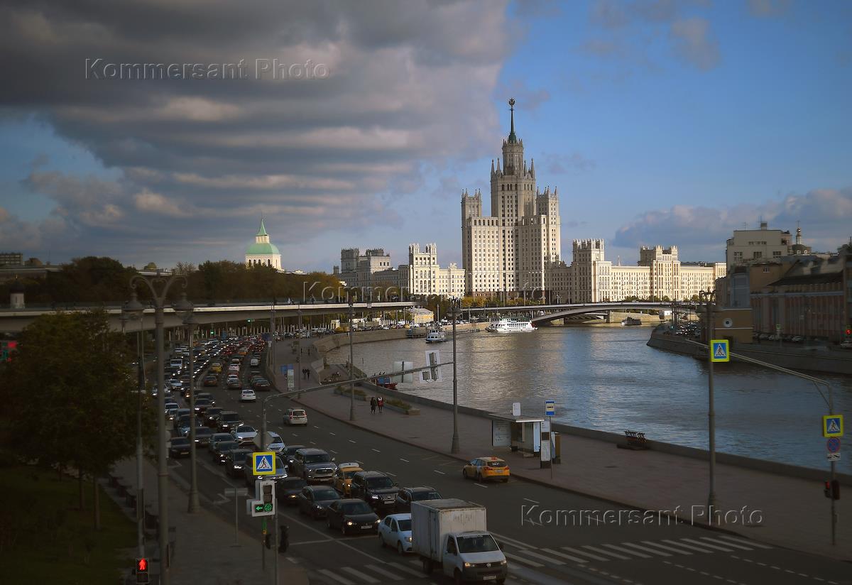 Views of Moscow. Traffic on the Moskvoretskaya embankment. High-rise residential building on Kotelnicheskaya embankment.