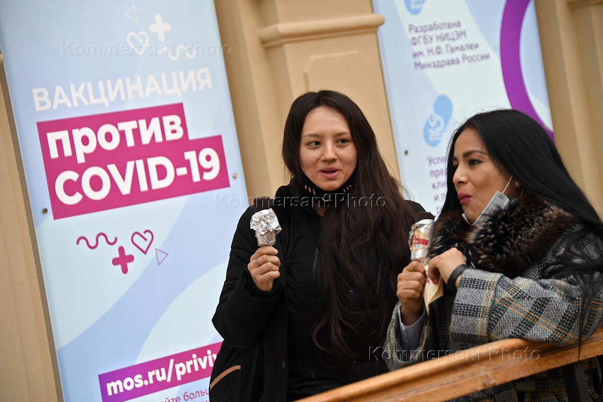 Центр вакцинации от коронавирусной инфекции COVID-19 на территории Главного универсального магазина (ГУМ). Жанровая фотография. Очередь людей на прививку вакциной "Гам-КОВИД-Вак" ("Спутник V") в здании ГУМа.
