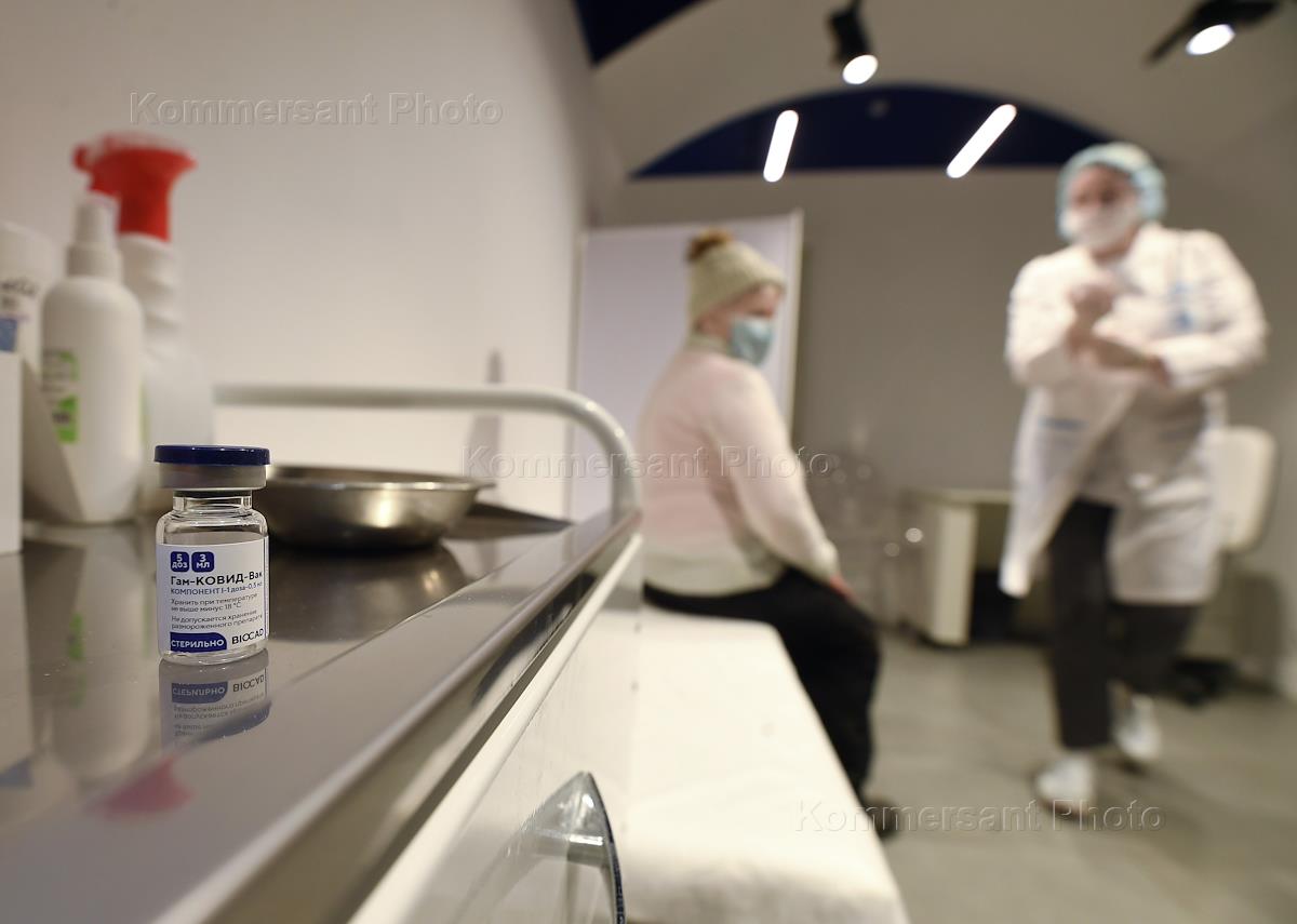 Центр вакцинации от коронавирусной инфекции COVID-19 на территории Главного универсального магазина (ГУМ). Жанровая фотография. Ампула с вакциной "Гам-КОВИД-Вак" ("Спутник V").