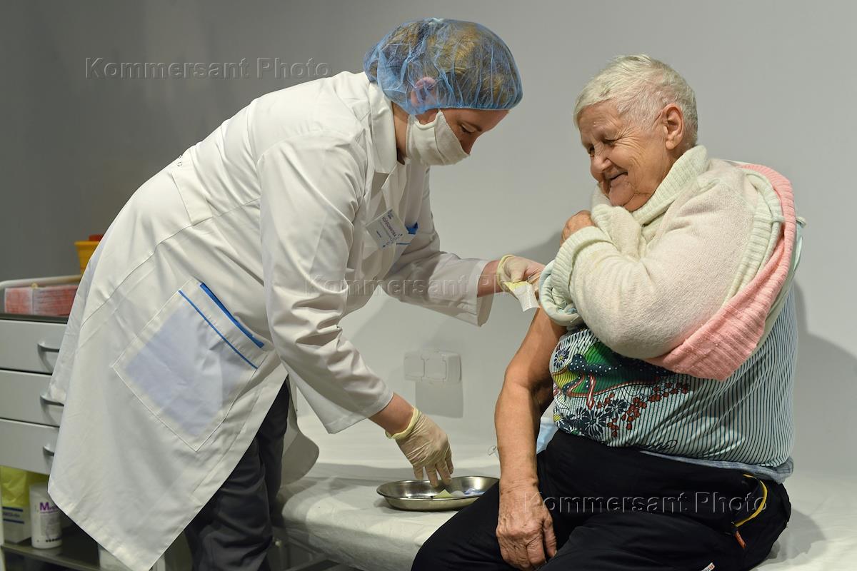 Центр вакцинации от коронавирусной инфекции COVID-19 на территории Главного универсального магазина (ГУМ). Жанровая фотография. Медицинский сотрудник делает пожилой женщине вакцину "Гам-КОВИД-Вак" ("Спутник V").