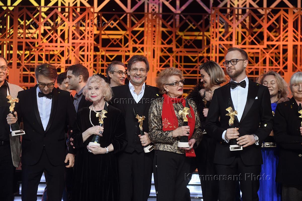 Торжественная церемония вручения премии "Золотой Орел" в 1-м павильоне киноконцерна "Мосфильм". Лауреаты премии на церемонии.