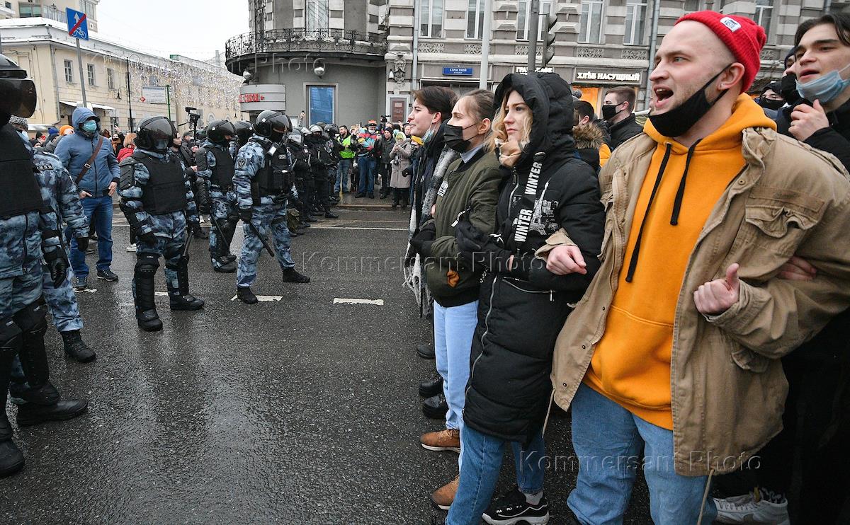 A rally in support of the politician Alexei Navalny at Pushkinskaya Square. Civil Society activist Gleb Maryasov (third from right) clashes with police officers at a rally.