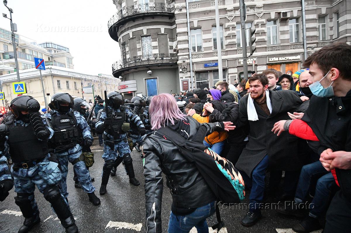 A rally in support of the politician Alexei Navalny at Pushkin Square. A clash between protesters and police officers.