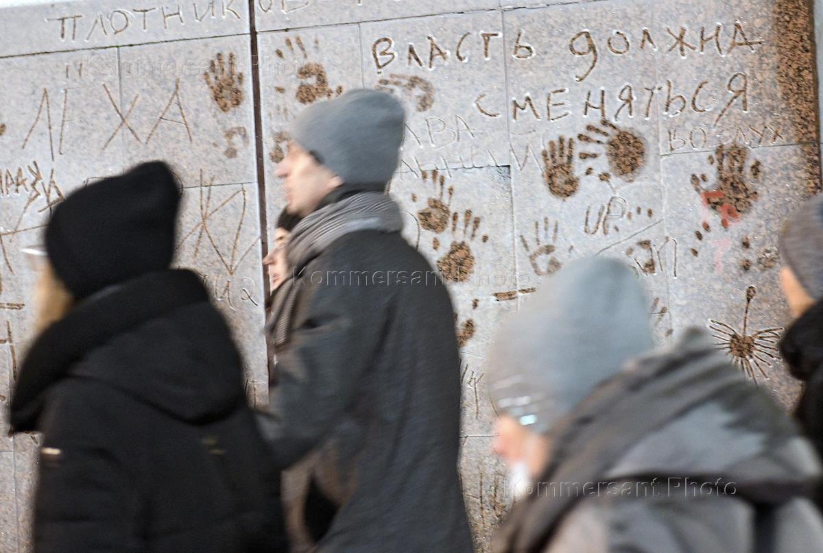 Rally to support Alexei Navalny at Tverskaya street. Genre photography. Handprints of the protesters on the wall of the pedestrian crossing.