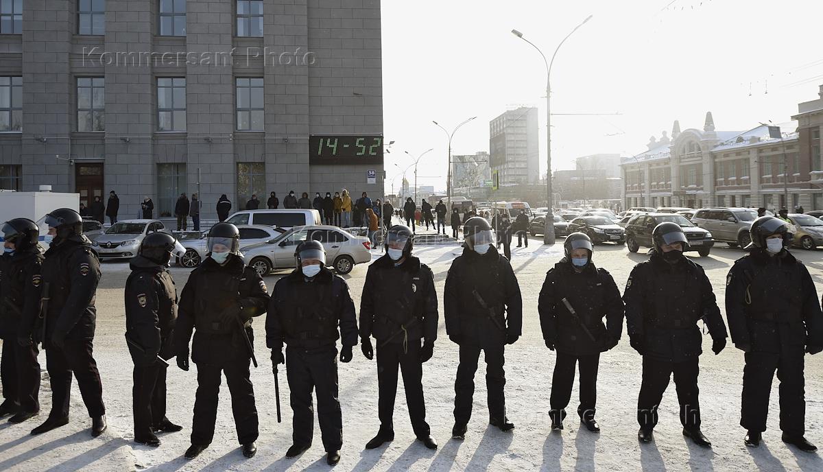 Митинг в поддержку политика Алексея Навального на Красном проспекте и Площади Ленина в Новосибирске. Сотрудники полиции во время оцепления места проведения митинга.
