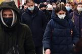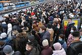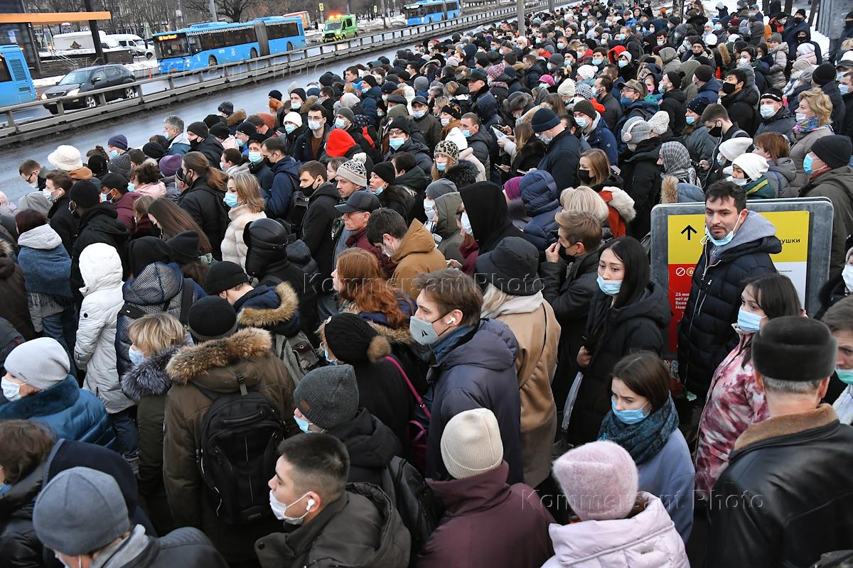 Закрытие участка "Беляево" - "Новые Черемушки" Калужско-Рижской линии Московского метрополитена. Жанровая фотография. Пассажиры перед входом в метро.