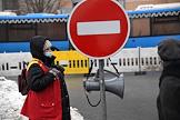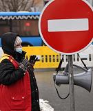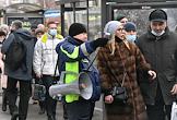 Закрытие участка "Беляево" - "Новые Черемушки" Калужско-Рижской линии Московского метрополитена. Жанровая фотография. Сотрудница метро с ручным мегафоном перед остановкой компенсационного автобуса.