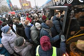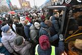 Закрытие участка "Беляево" - "Новые Черемушки" Калужско-Рижской линии Московского метрополитена. Жанровая фотография. Пассажиры перед входом в компенсационный автобус.