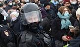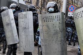 Митинг в поддержку политика Алексея Навального. Участники во время митинга. Сотрудники полиции с защитными щитами в оцеплении места проведения митинга.