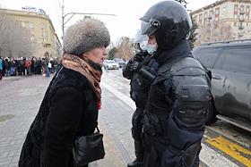 Митинг в поддержку политика Алексея Навального. Участники во время митинга. Сотрудники полиции разговаривают с пожилой женщиной.