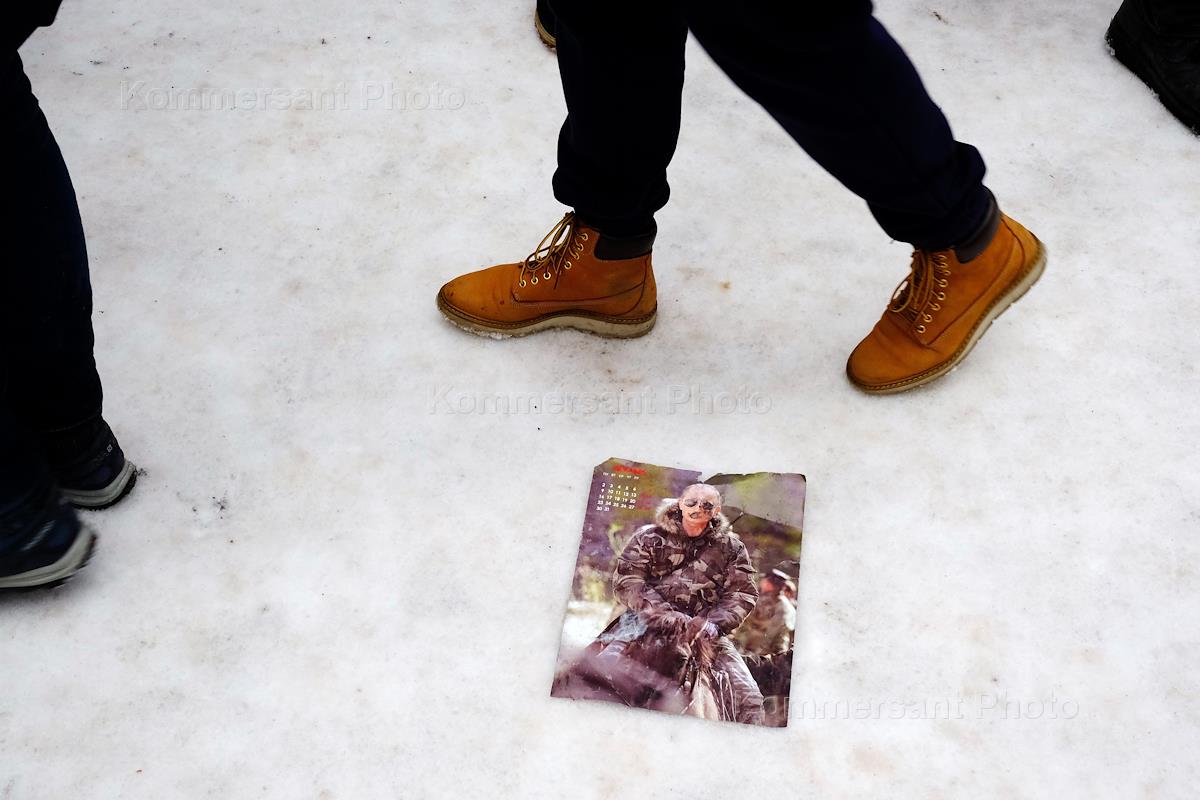 Rally in support of politician Alexei Navalny at Senate Square. Genre photography. A calendar sheet with a portrait of Russian President Vladimir Putin lying in the snow.