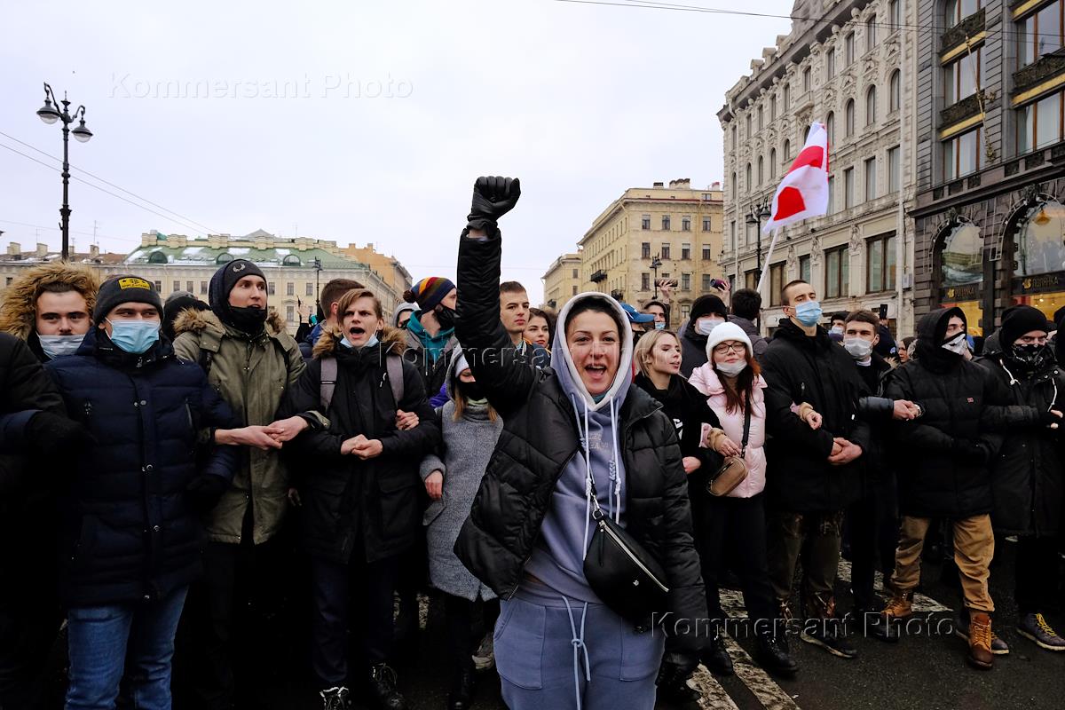 Несогласованная акция в поддержку задержанного оппозиционера Алексея Навального в центре Санкт-Петербурга. Участники во время акции на Невском проспекте.