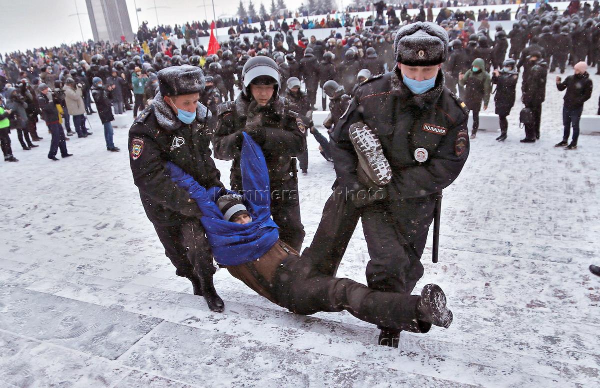 Шествие и митинг в поддержку политика Алексея Навального. Сотрудники полиции во время задержания участника митинга.