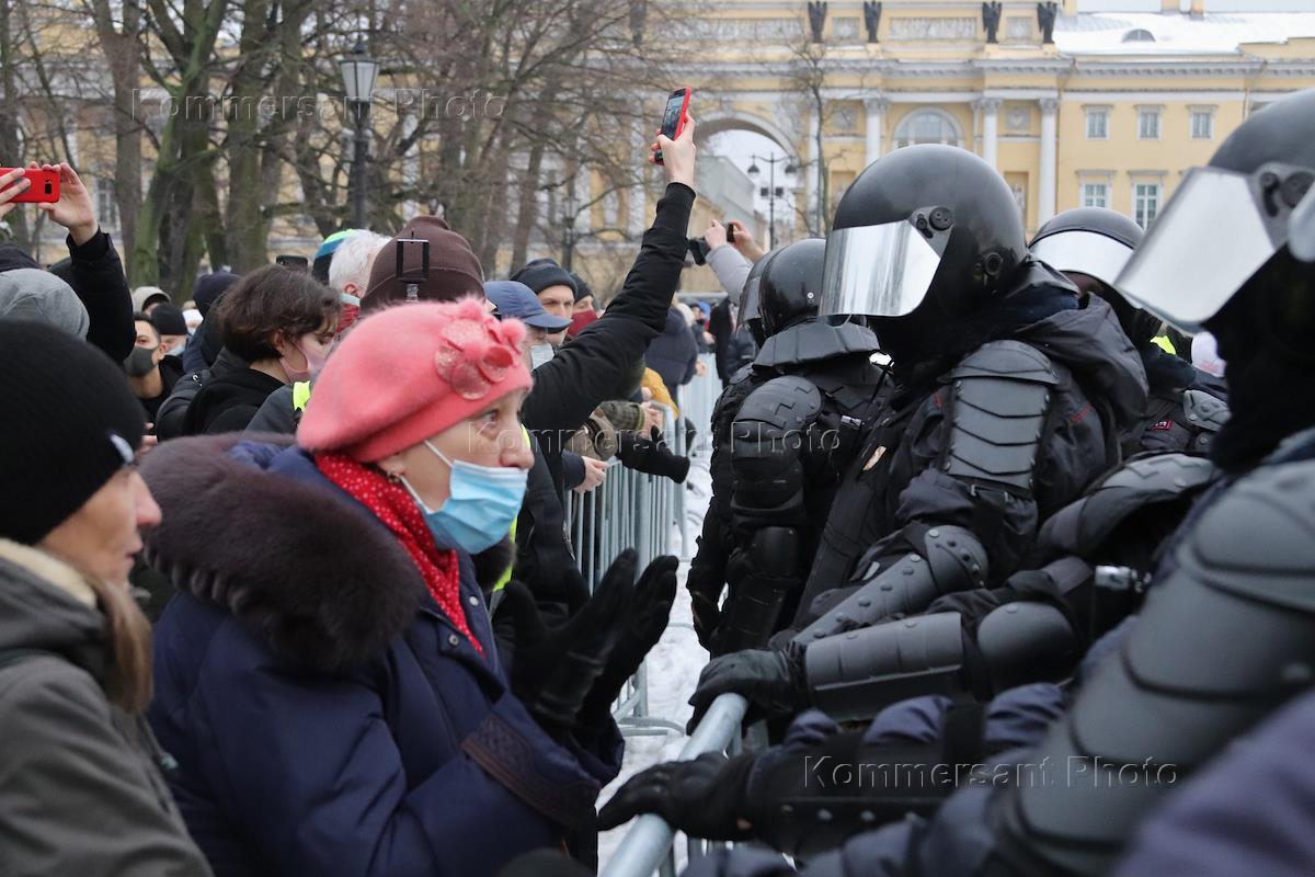 Несогласованная акция в поддержку задержанного оппозиционера Алексея Навального на Сенатской площади. Участники во время акции.