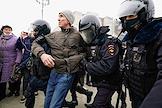 Акция в поддержку задержанного оппозиционера Алексея Навального. Корреспондент ИД "КосммерсантЪ" Владимир Соловьев (слева) и сотрудники ОМОН во время акции.