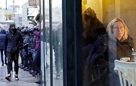 Акция в поддержку задержанного оппозиционера Алексея Навального на Пушкинской площади. Участники акции, сотрудники полиции и посетители кафе во время проведения акции.