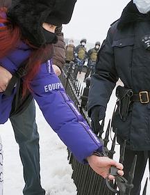 Акция в поддержку задержанного оппозиционера Алексея Навального на Сенатской площади. Сотрудники полиции во время задержания участницы акции.
