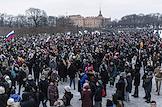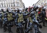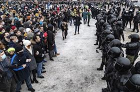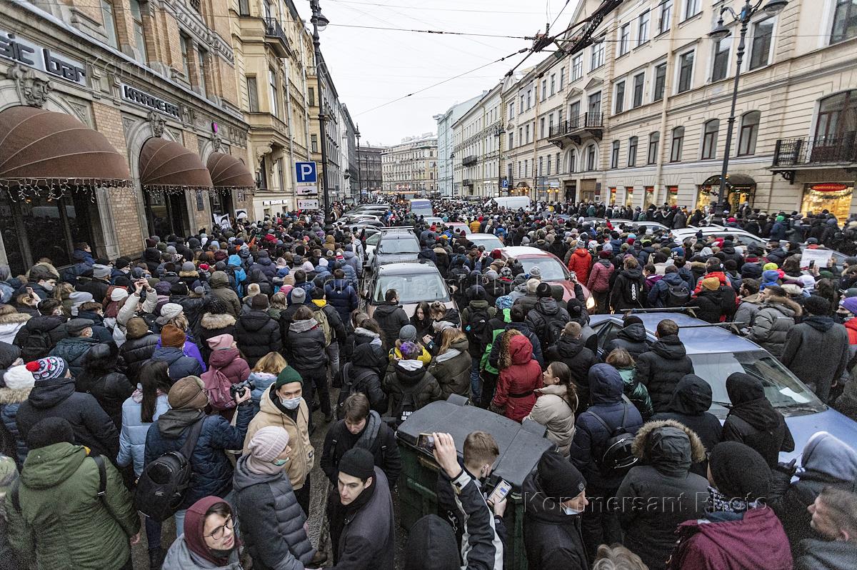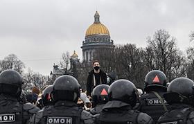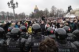 Акция в поддержку задержанного оппозиционера Алексея Навального на Сенатской площади. Сотрудники полиции в оцеплении и участники во время акции.
