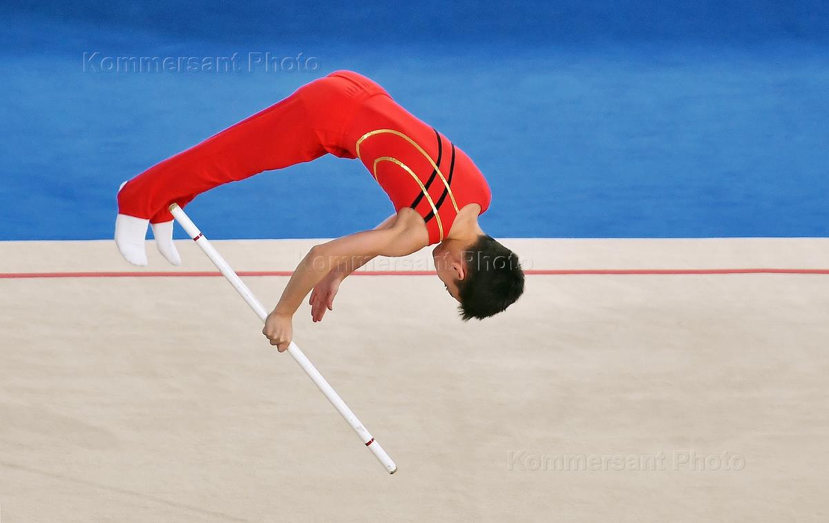 Первенство России по художественной гимнастике 2021 во Дворце гимнастики Ирины Винер-Усмановой. Первые в истории соревнования среди юношей. Гимнаст Данияр Гильметдинов во время упражнений с гимнастической палкой.