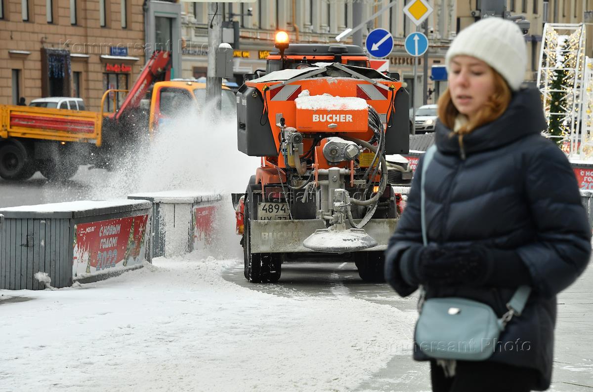 Views of Moscow. Genre photography. Snow removal equipment while cleaning the street after a snowfall.