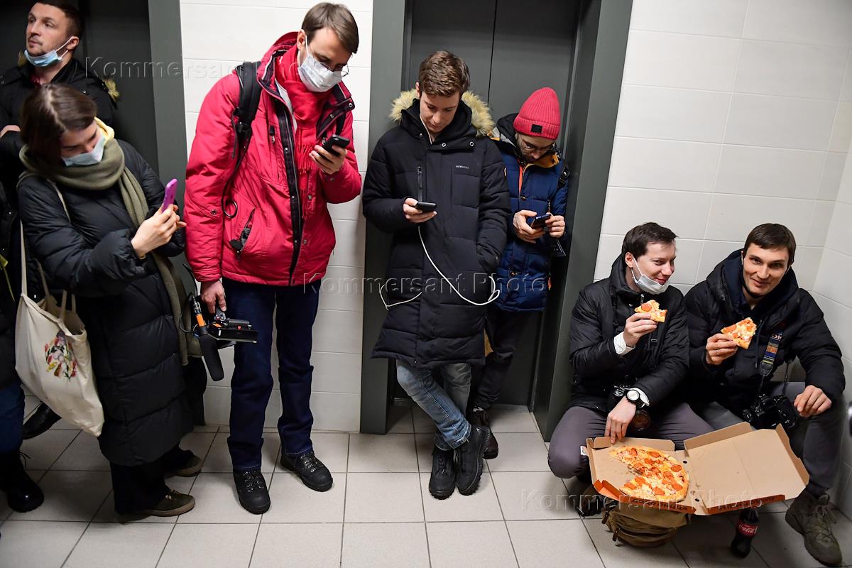 Обыск в квартире супруги политика Алексея Навального Юлии Навальной. Фотограф международного агентства Reuters Максим Шеметов (второй справа) и фотограф агентства The Associated Press (AP) Павел Головкин (справа) в лифтовом холе подъезда.