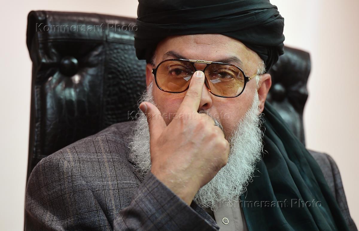 Пресс-конференция представителей запрещенного в России движения "Талибан" в Radisson Collection Hotel (гостиница "Украина"). Руководитель политофиса радикального движения "Талибан" (террористическая организация, запрещенная на территории России) Шер Мохаммад Аббас Станакзай (в центре) после окончания пресс-конференции.