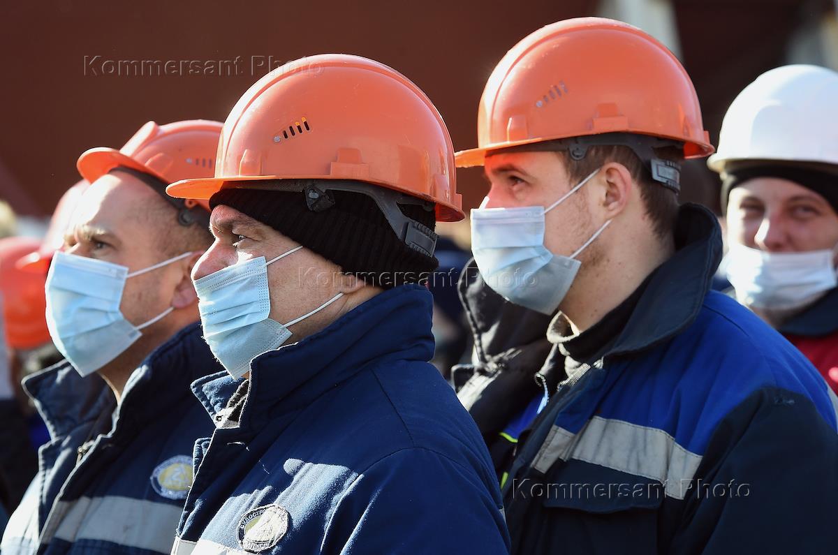 Церемония спуска на воду патрульного корабля "Сергей Котов" на судостроительном заводе "Залив". Рабочие судостроительного завода в медицинских масках во время церемонии.