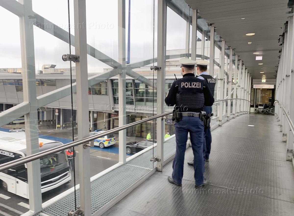 Ситуация у аэропорта Берлин-Бранденбург, откуда должен вылететь в Россию оппозиционер Алексей Навальный, после лечения в Германии. Черный автомобиль Audi с мигалкой (в центре), на которой подвезли Алексея Навального к самолету. Сотрудники полиции Германии у здании аэропорта.