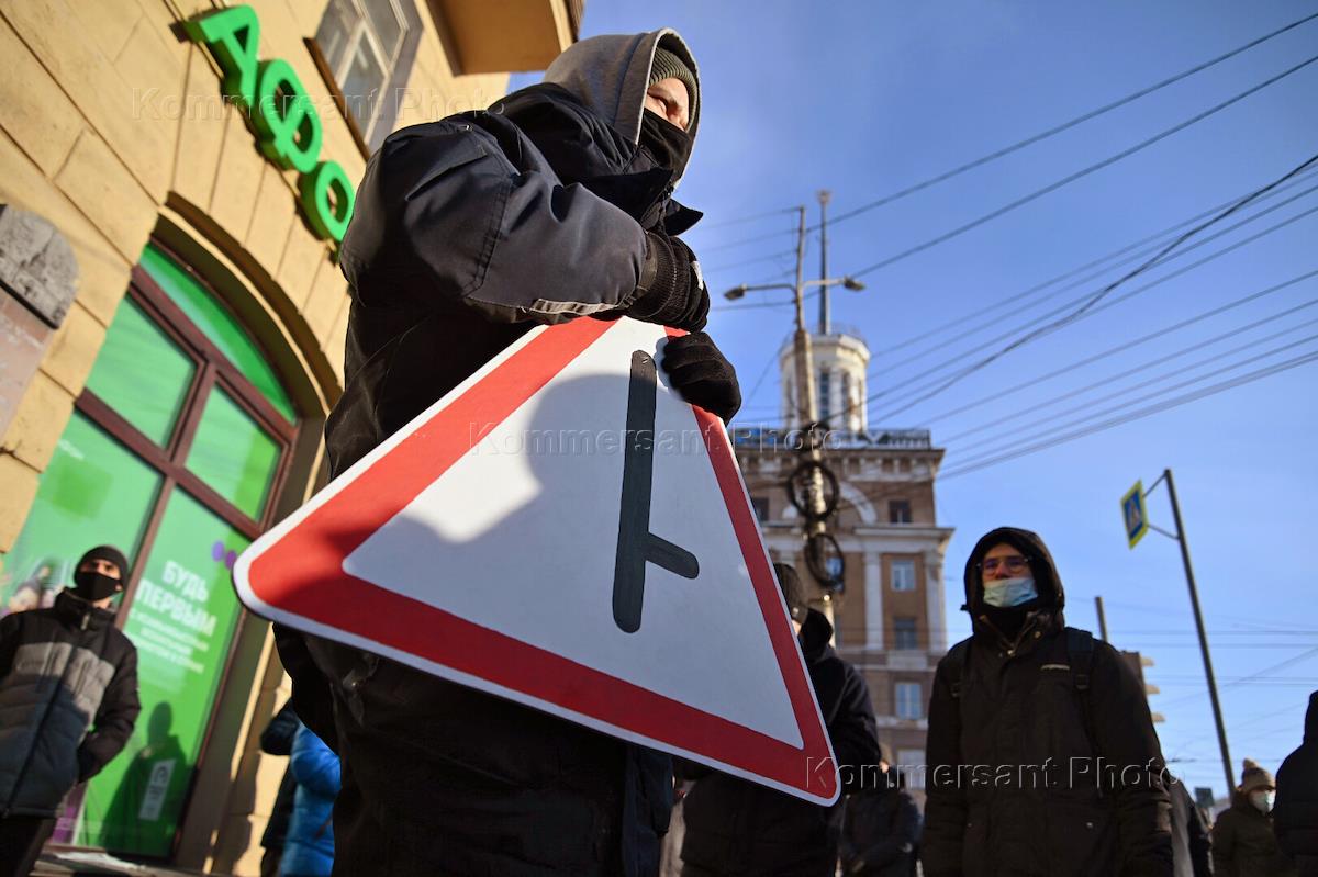 Несогласованная акция в поддержку политика Алексея Навального в Омске. Участник акции с дорожным знаком "Примыкание второстепенной дороги".