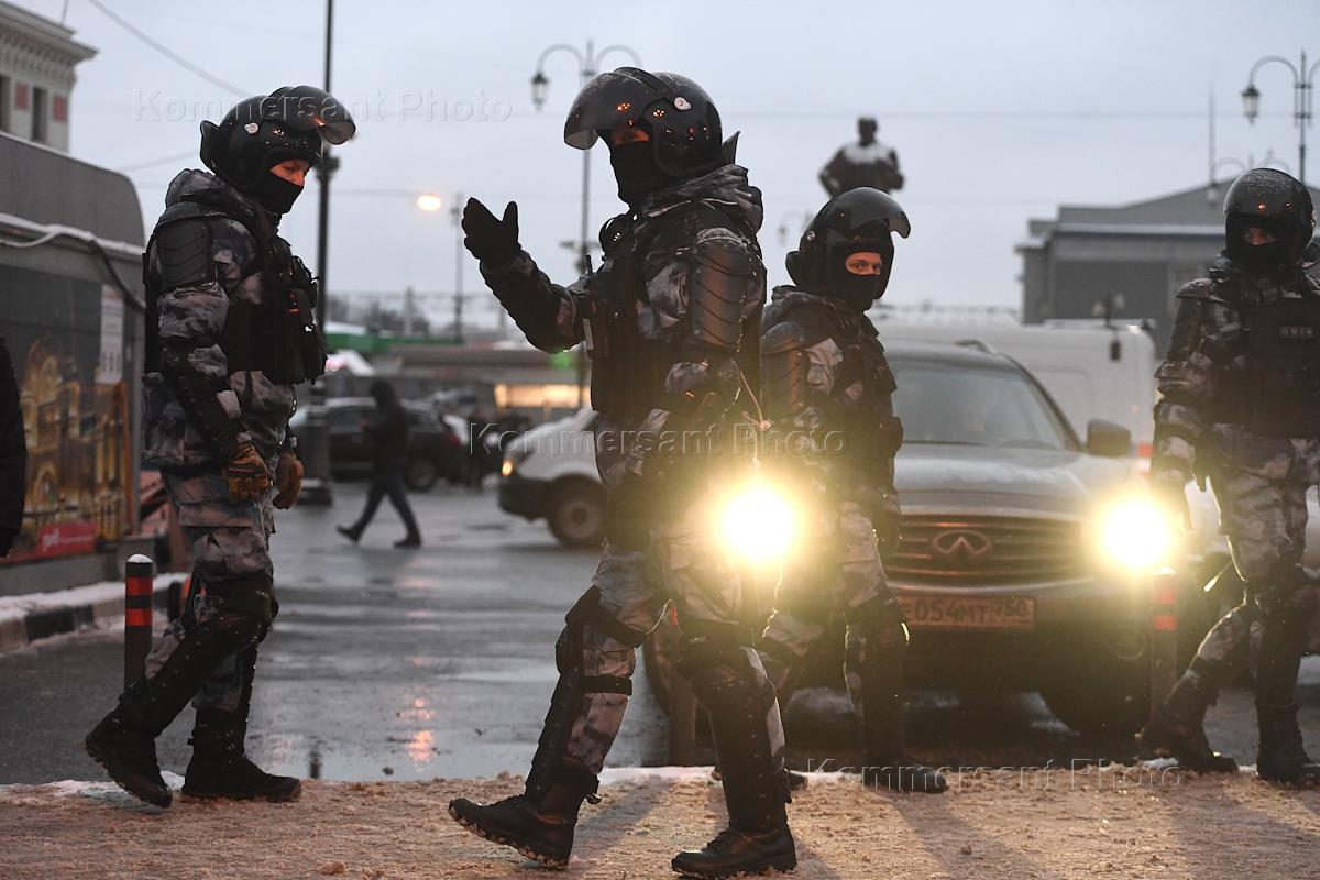 Law enforcement officers at the closed Kitay-Gorod metro station before an unauthorized rally in support of politician Alexei Navalny in Moscow.