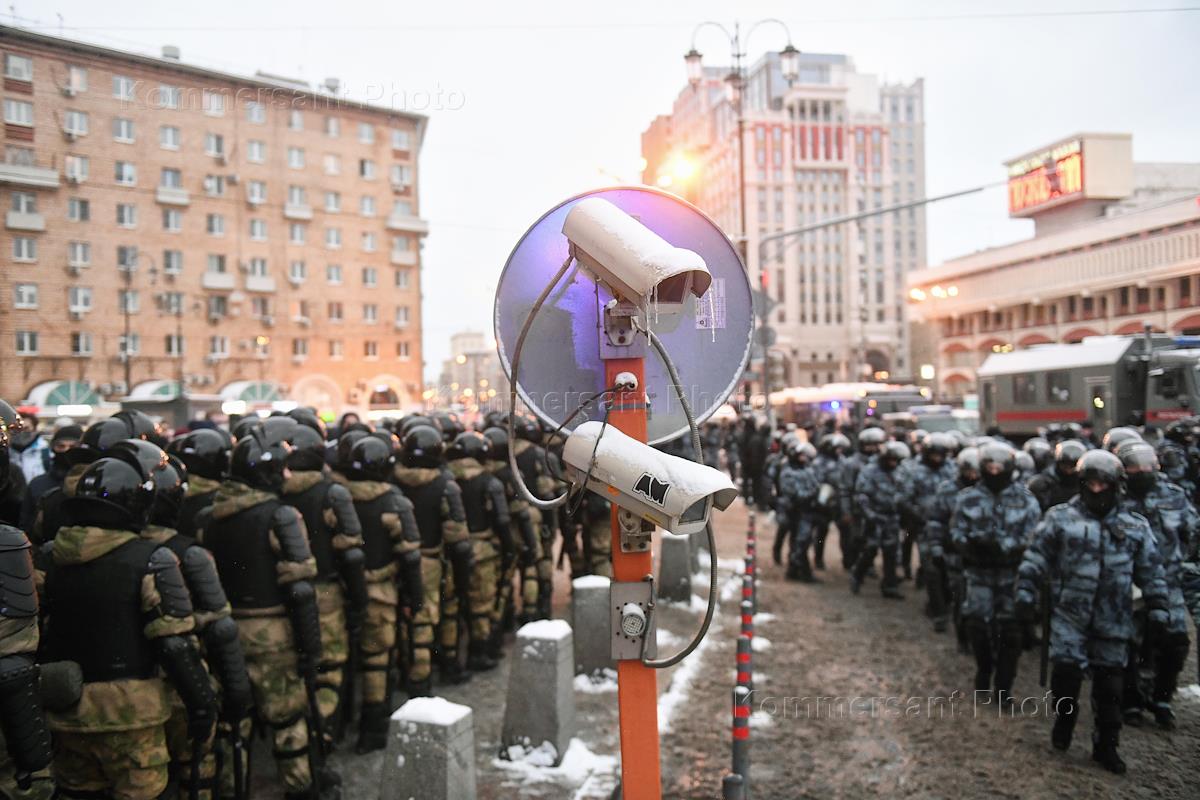 An unauthorized rally in support of opposition leader Alexei Navalny in Moscow. Police officers cordoned off on Kalanchevskaya Street.