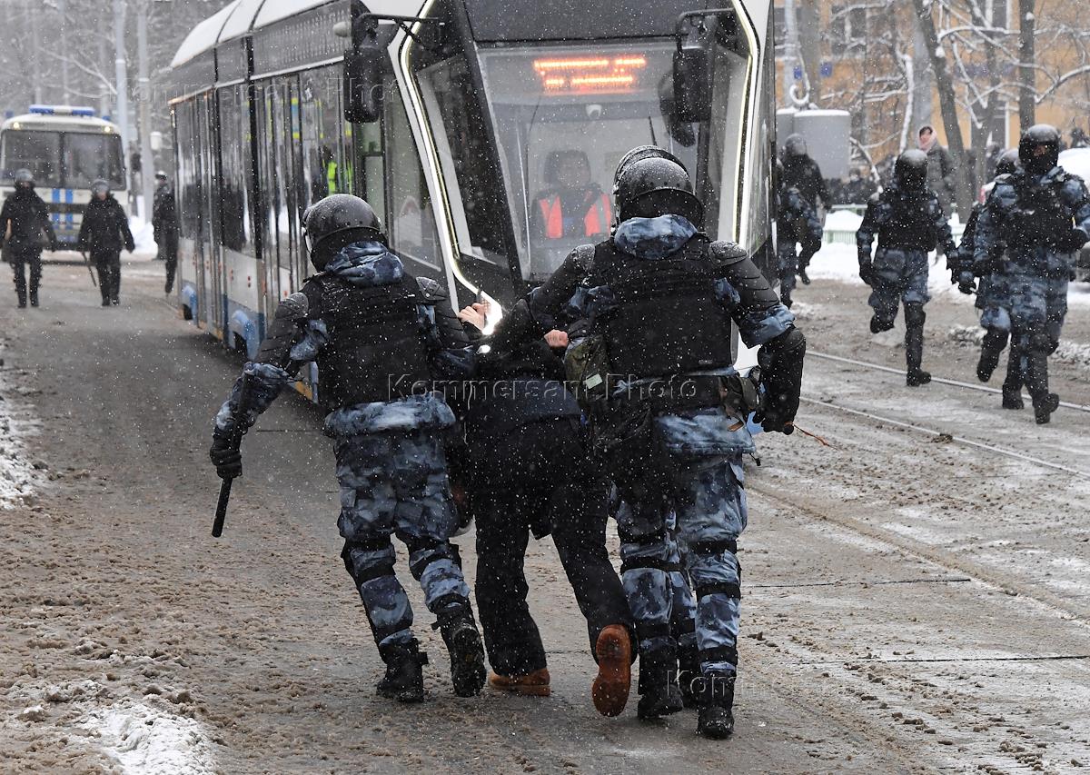 An unauthorized rally in support of opposition leader Alexei Navalny in Moscow. Law enforcement officers arresting protesters.