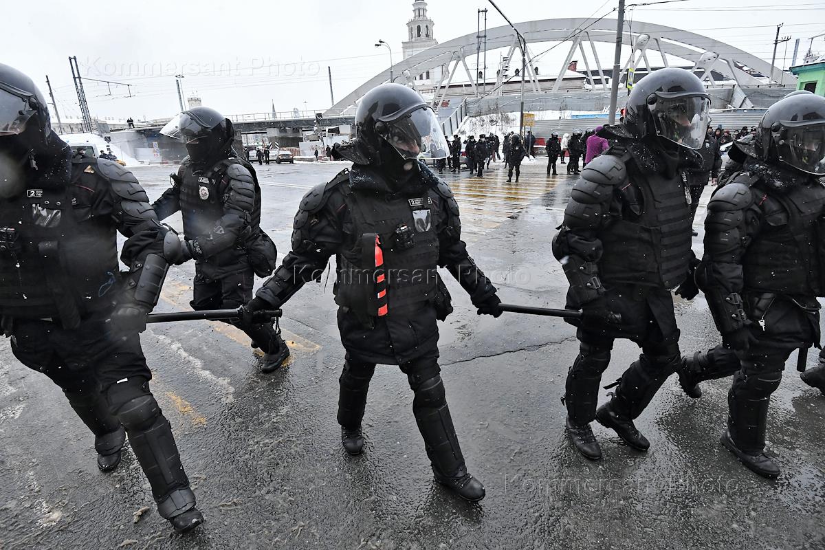 Unauthorized rally of supporters of opposition leader Alexei Navalny in Moscow. Law enforcement officers during the detention of protesters in the city center.