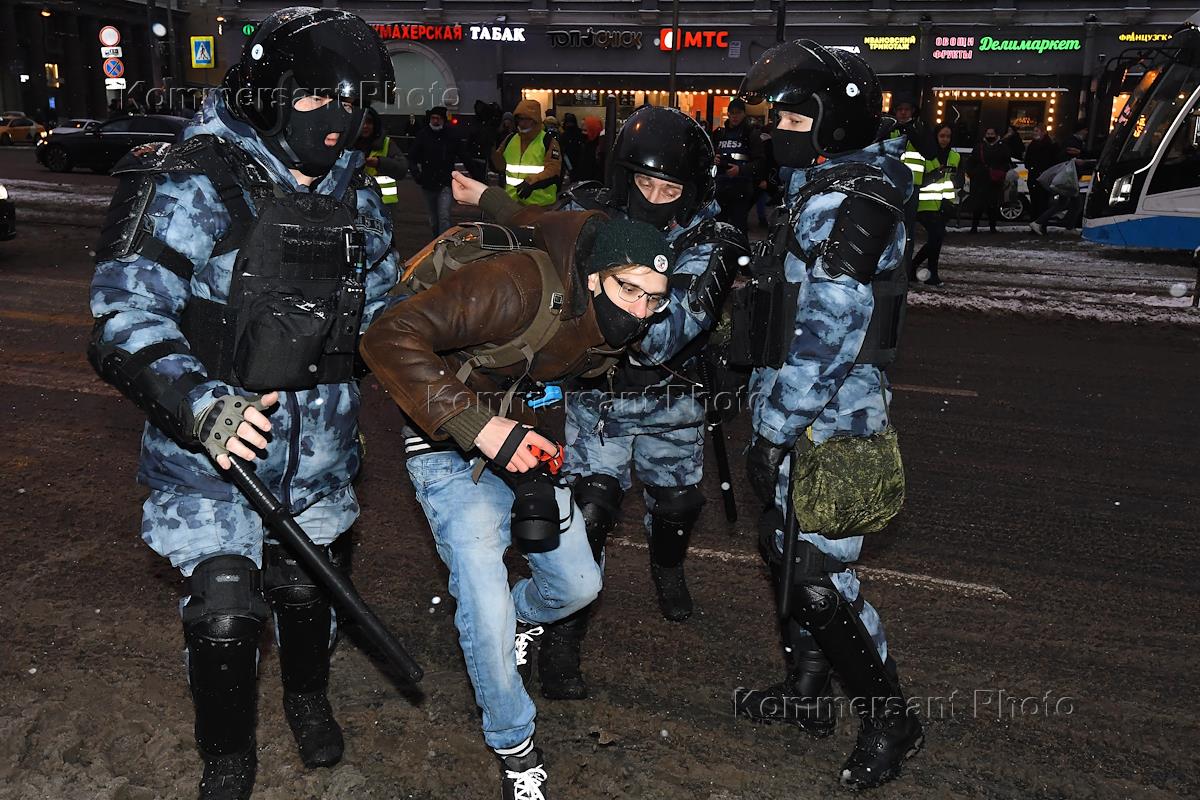 An unauthorized rally in support of opposition leader Alexei Navalny in Moscow. Law enforcement officers arresting protesters.