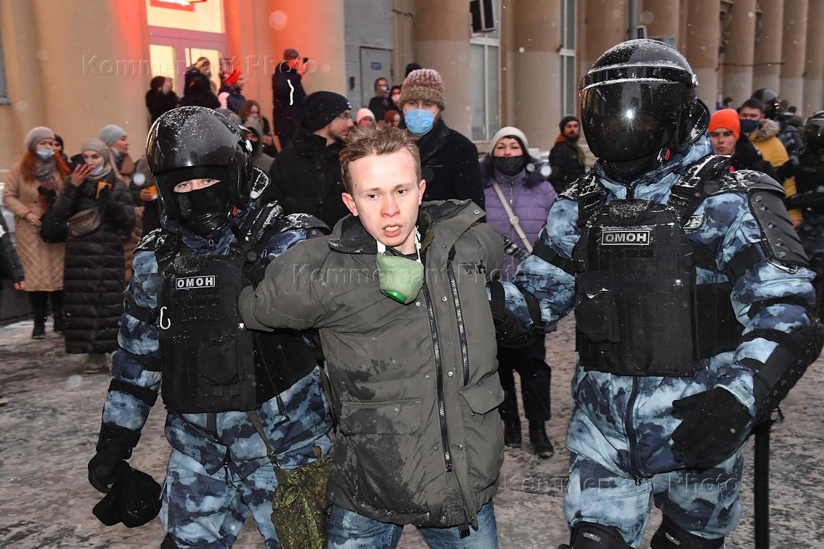 An unauthorized rally in support of opposition leader Alexei Navalny in Moscow. Law enforcement officers arresting protesters.
