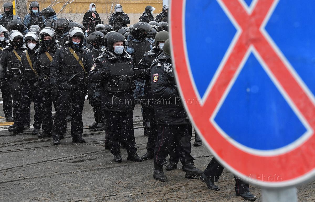 An unauthorized rally in support of opposition leader Alexei Navalny in Moscow. Police officers cordoned off on Kalanchevskaya Street.