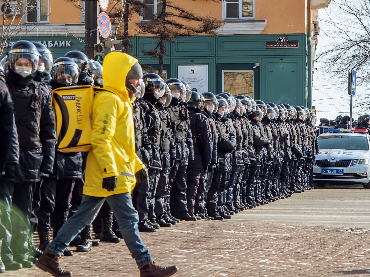 Несогласованная акция сторонников политика Алексея Навального в Хабаровске. Сотрудники полиции во время акции.