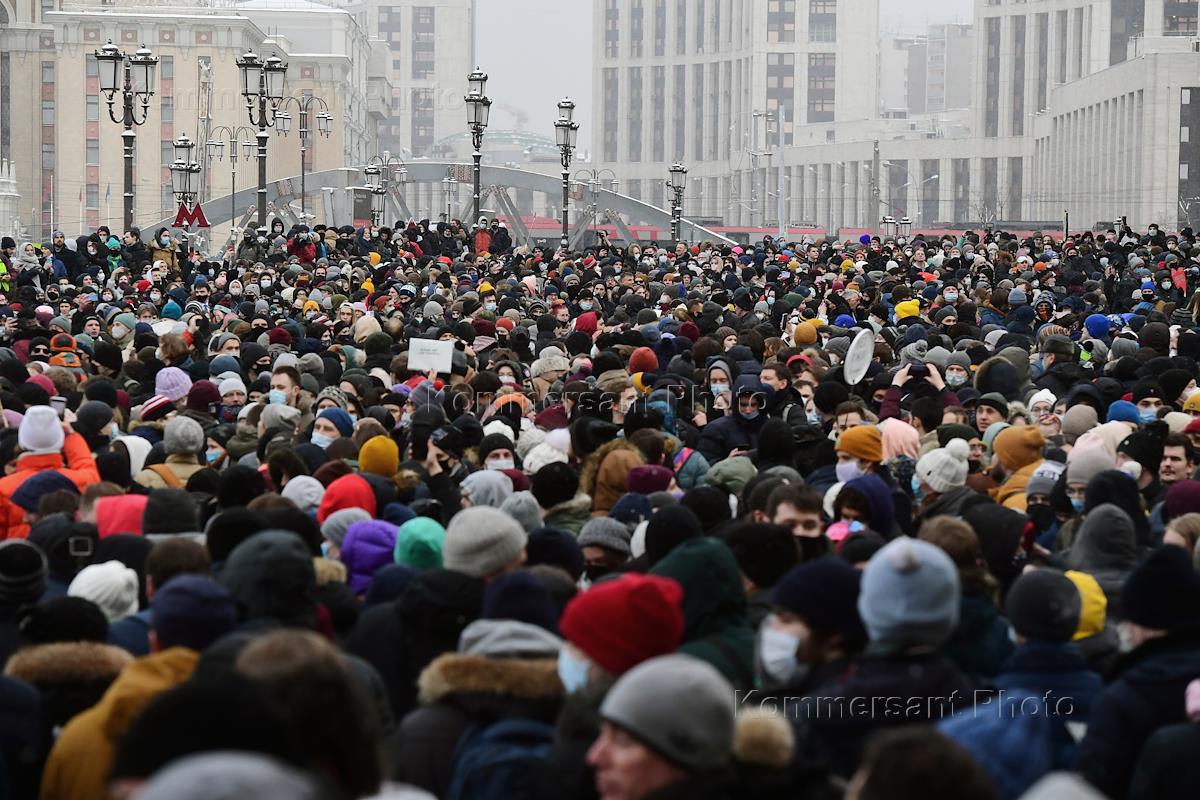 An unauthorized rally in support of opposition leader Alexei Navalny in Moscow. Participants of the rally in the city center.