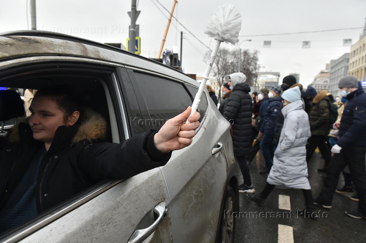 Несогласованная акция в поддержку оппозиционера Алексея Навального в центре города. Участники акции в автомобилях держат туалетные ершики в окне.